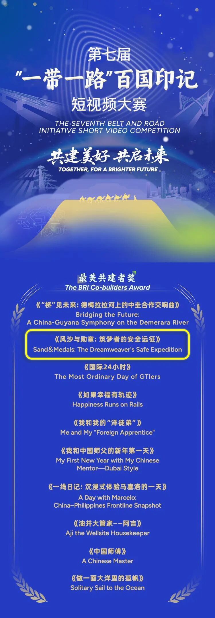 日前,由中國公共外交協(xié)會、環(huán)球網聯合主辦,國務院國資委新聞中心、中國駐柬埔寨王國大使館、柬埔寨王國駐華大使館、中國駐南非共和國大使館、中國駐保加利亞共和國大使館、中國駐塞爾維亞共和國大使館支持的第七屆“一帶一路”百國印記短視頻大賽落下帷幕,大賽以“共建美好,共啟未來”為主題,吸引了來自全球130余個國家和地區(qū)的近2000部作品參賽。經過激烈角逐,共有161部作品脫穎而出,哈電集團短視頻作品《風沙與勛章:筑夢者的安全遠征》榮獲“最美共建者”獎。